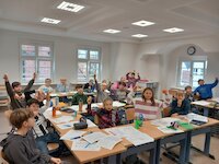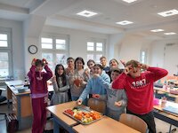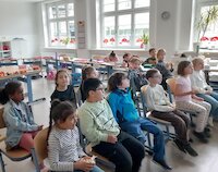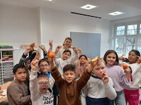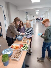 Bedient wurde im Übrigen auch. Die Klassen 3 machten aus Quark zwar keinen Quatsch, wohl aber anregende Kräuter-Schotten mit Körnerbrot oder eine fruchtige Variante aus Apfel, Beeren oder Birnen als Früchtequark. Dass wir auf so vielfältige Weise uns an diesen gesunden Lebensmittel erlaben konnten, hatten wir insbesondere dem EDEKA Center Leipold zu verdanken. Carsten Leipold und seine Mannschaft stellten uns bereitwillig ein riesiges Potpourri leckerster gesunder Genussmittel zur Verfügung, sodass die Kinder hingebungsvoll schlemmen durften. Aber natürlich kam der Bildungsauftrag keinesfalls zu kurz. Mithilfe der Ernährungspyramide checkten wir das eigene Frühstück, illustrierten selbst eine, verinnerlichten die Regeln der Esskultur oder ließen uns von den Checker Tobi oder Woozle Goozle erklären, was und wie Menschen aller Herren Länder essen.