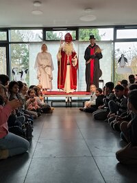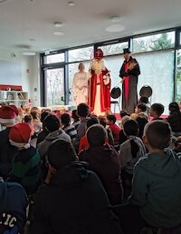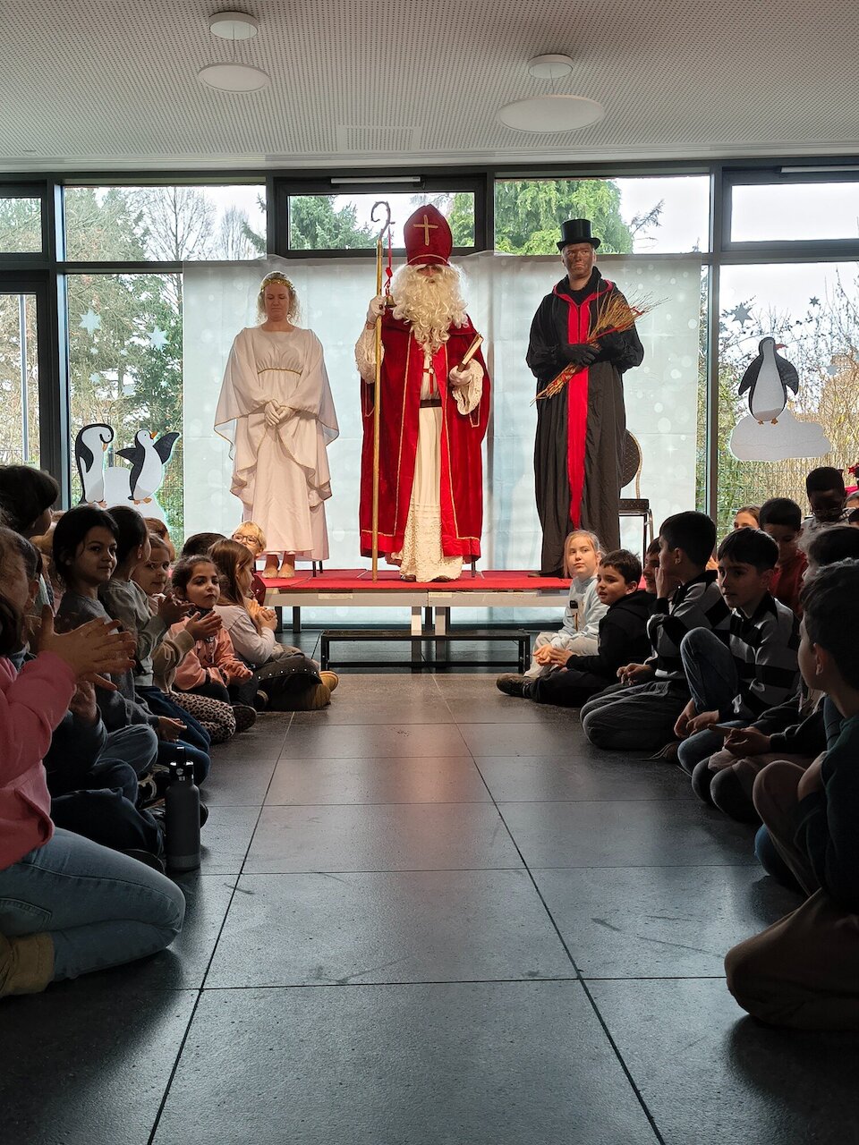 Bis zum Pausengong war alles gleich, doch als die ersten Kinder das Triumvirat aus Engelchen, Knecht Ruprecht und Nikolaus sahen, verbreitete sich die Kunde wie ein Lauffeuer auf dem Schulhof. "Der Nikolaus ist da!", hörte man es von überall her. Als wir uns in der Pausenhalle versammelten und auf den hohen Besuch warteten, war einerseits abwartendes Schweigen, andererseits Getuschel zu vernehmen. Kaum dass Nikolaus mit Mitra, Hirtenstab und Bischofsgewand die Bühne betrat, ebbten die letzten Stimmchen ab und alle waren froh und munter. Auf die Frage, ob auch alle brav gewesen seien, kam ein allerorts gut vernehmbares "Ja". Knecht Ruprecht prüfte dieses mit einem durchdringenden Blick.