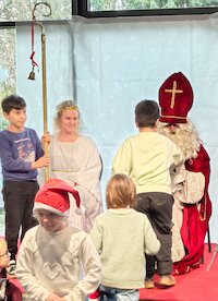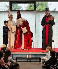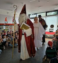 Im Anschluss nahm sich Nikolaus die Zeit, Kinderstimmen, die mehr oder minder bekanntes Gedicht- und Liedgut darboten, zu lauschen. Allen Darbietungen, ob nun von Theodor Storm, Joseph von Eichendorff oder Heinz Erhardt, bescheinigte unser Gast einen gelungenen Auftritt. Da erübrigte sich auch die Frage nach der Rute oder seinem treuen Gehilfen ganz schnell.